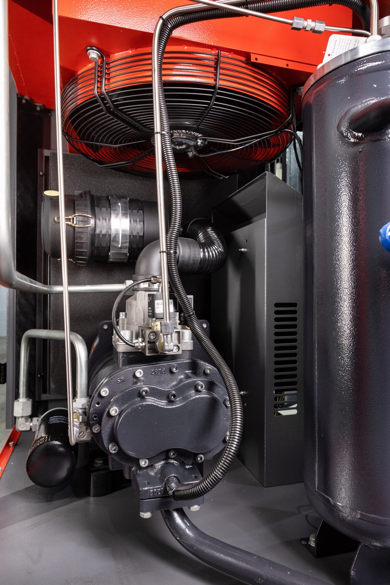 Организована с выходом охлаждающего воздуха вверх, что позволяет избежать подмеса горячего воздуха на всасывании. Оснащена независимым электроприводом и запускается в работу в зависимости от температуры. В этом случае отпадает необходимость использования большого масляного контура и дополнительных трубок к нему, за счет чего сокращается объём масла, используемого в компрессоре.