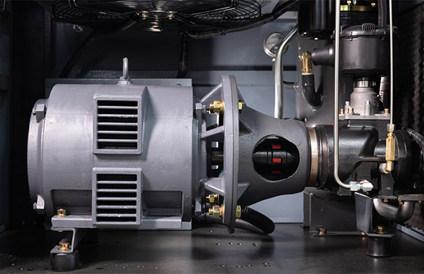 Высокий показатель передачи КПД реализуется с помощью эластичной муфты, способной так же гасить все вибрационные нагрузки во время пуска и работы компрессора. Благодаря конструкции, в которой валы винтового блока и электродвигателя находятся на одной оси – винтовые компрессоры с таким принципом передачи КПД имеют индекс “повышенной мощности” и отличаются высокими показателями надёжности.