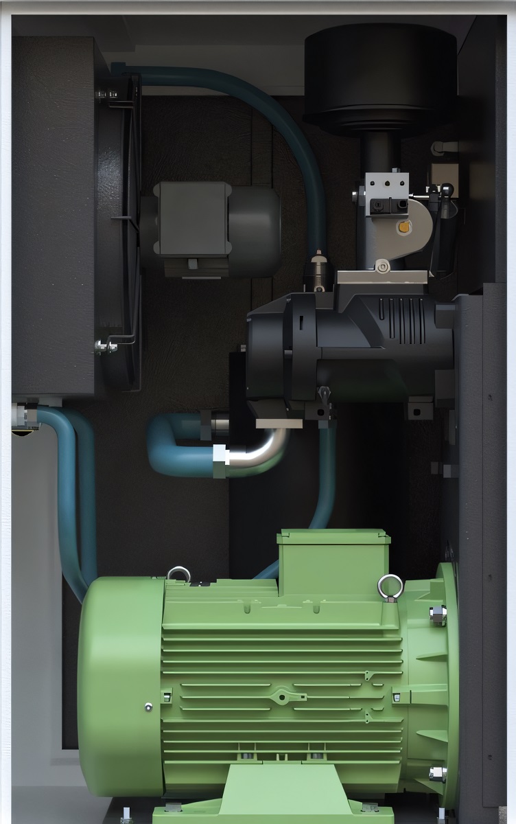 Высокоэффективная и надежная шкиво-ременная система привода от электродвигателя к компрессор. Простая в обслуживании и замене.